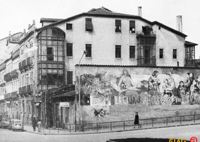 En 1926, Manuel Sás e Sequeiros, solicita a modificación do proxecto previo para un Pavillón de Exposición e veda de vehículos a motor, deseñado polo arquitecto Manuel Conde Fidalgo e presentado en 1925, que consistiría na elevación da altura do inmoble ao engadir un piso máis, destinado a almacén ou vivenda, variando a decoración da fachada, e modificando lixeiramente as proporcións de portas e ventás.