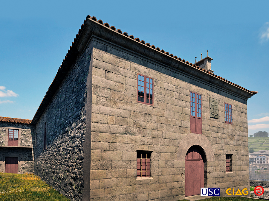 O muro oeste estaba blasonado polos tres escudos: mascarón-carteleira con follaxe e óvalo con inscrición “M. YAL. SDI/GINES MONTENEG/RO, E O S. D. J. BERB/ETOROS. S MIJO A/NON MDCCXII“. Brasón con árbore centrada, touros enfrontados e coroa sobre a de Montenegro como sinal de nobreza. Os dous continúan nos muros do pazo. E pedra armeira cuarteada con armas de Losada, Ribadeneira, Berbetoros e Lemos, en paradoiro descoñecido. Situados nas columnas da solaina están situados os escudos de Taboada e Montenegro.